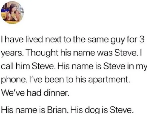 Getting to know your neÂighbors is crucial, and not doing so can cause awkward situations. It’s strange that Brian let this confusion over his name go on, even after dining together.